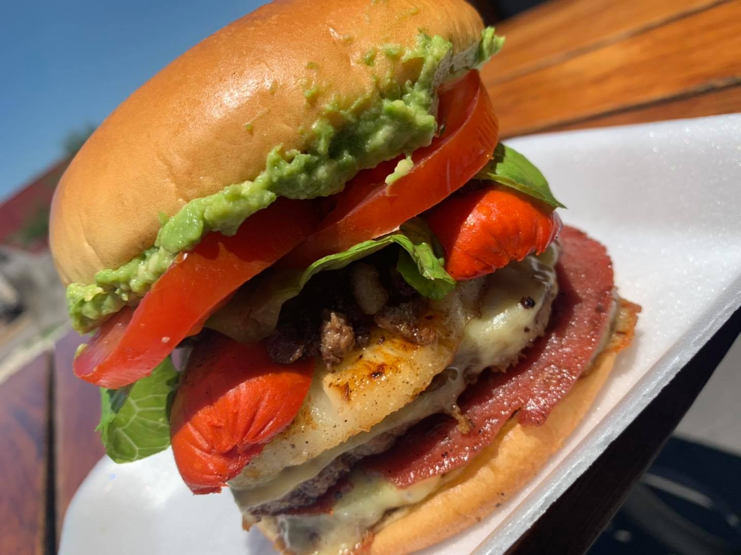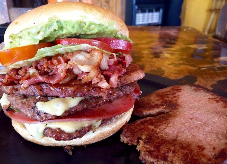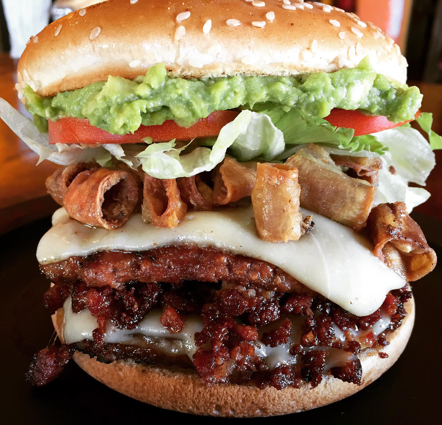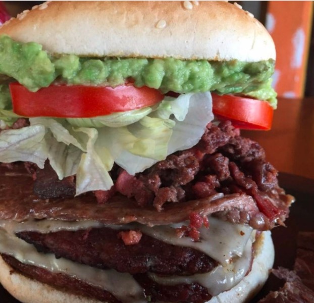 Doble carne, queso, tocino, lechuga, tomate, aguacate, jamón y chuleta ahumada.