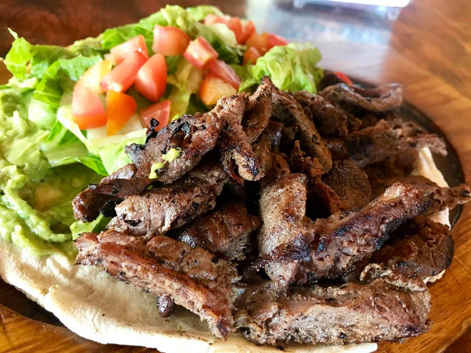 Pan árabe, aguacate, lechuga, tomate, y fajitas de arrachera.