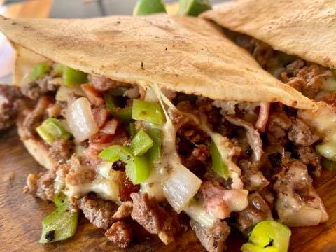 Pan árabe, sirloin asado, tocino, cebolla, chilaca, queso y frijoles.