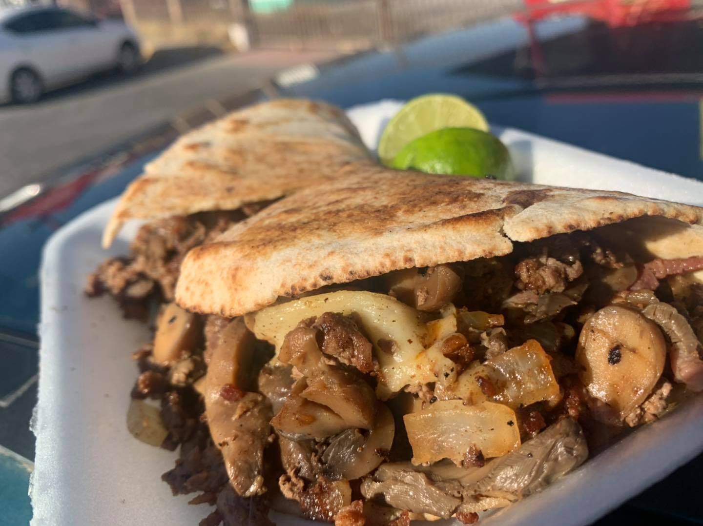 Pan árabe, sirloin asado, tocino, queso, chilaca, cebolla, champiñones y frijoles.