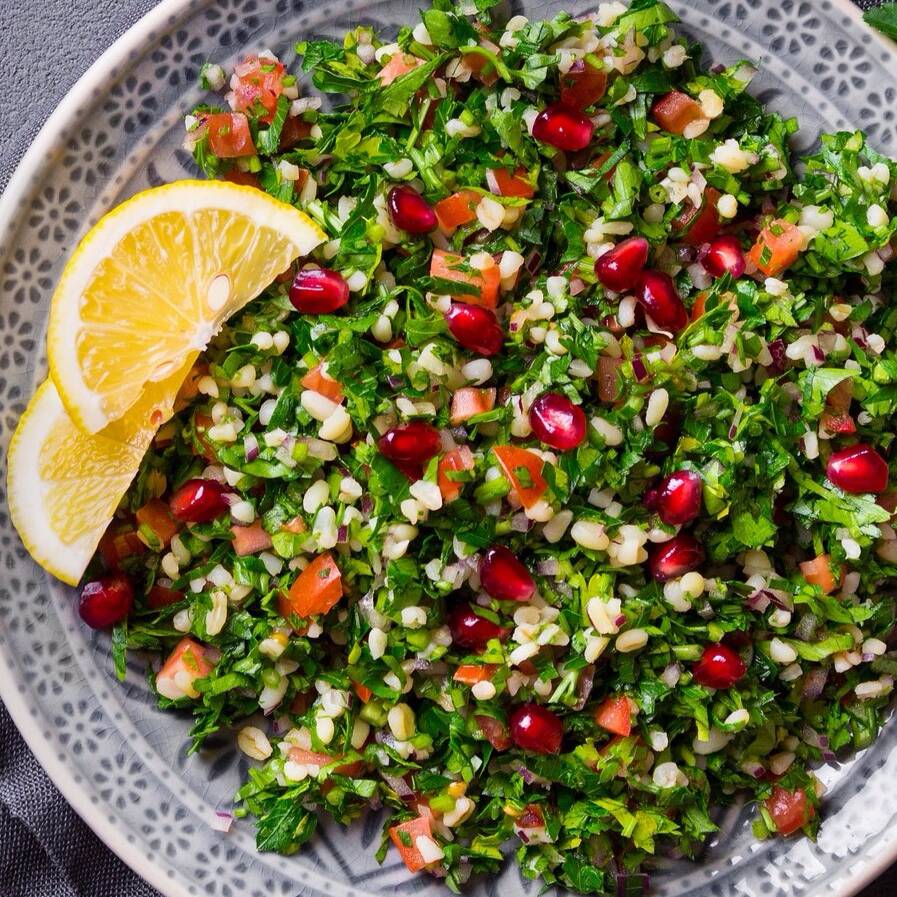 la tardicional y saludable ensalada arabe (perejil , tomate , trigo, jugo de limon , granada y un toque de aceite de oliva ) porcion 1/4 litro
