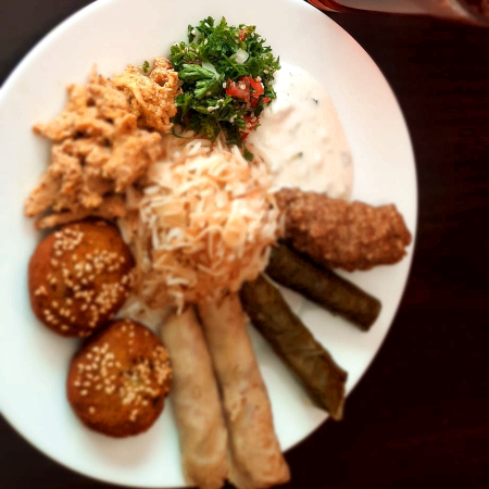 Kofta (pastel de carne ) + shawerma de pollo (pechuga de pollo marinada en salsa árabe e)+ 2-hoja de parra rellena con arroz y carne y hierbas finas y cocido al vapor+2 hojas de repollo rellenas con arroz y carne 2-falafel croquetas de habas molidas con especies y empanizada+arroz arabe+ zabadi+pan árabe+tabule