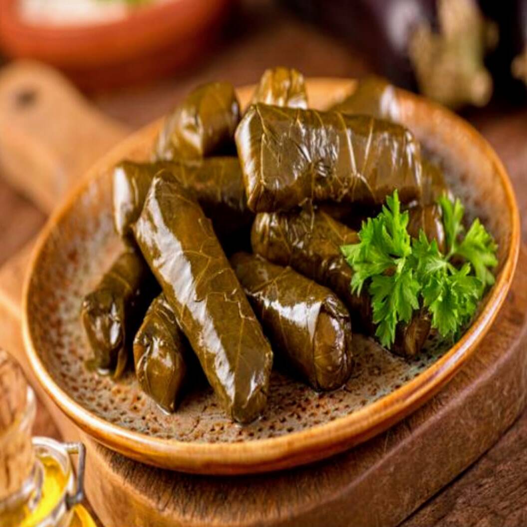 Hojas de parra rellena con arroz y carne sazonada con especies árabes + porcion de zabadi(orden 10 rollos)