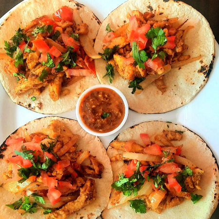 4 tacos de tortillas de maiz rellenas con shawerma de pollo (pechuga de pollo estilo arabe )