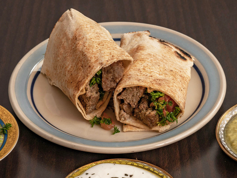 Pan árabe, relleno con pastel de carne, con especies árabes + porción de zabadi+ensalada