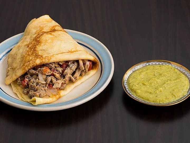 Riquísima crepa rellena con pechuga de pollo marinada en salsa árabe y guisada con cebolla y tomate
