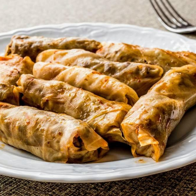 Hojas de repollo rellena con arroz y carne sazonada con hierbas finas se acompañan con una porcion de zabadi (orden 10 rollos )
