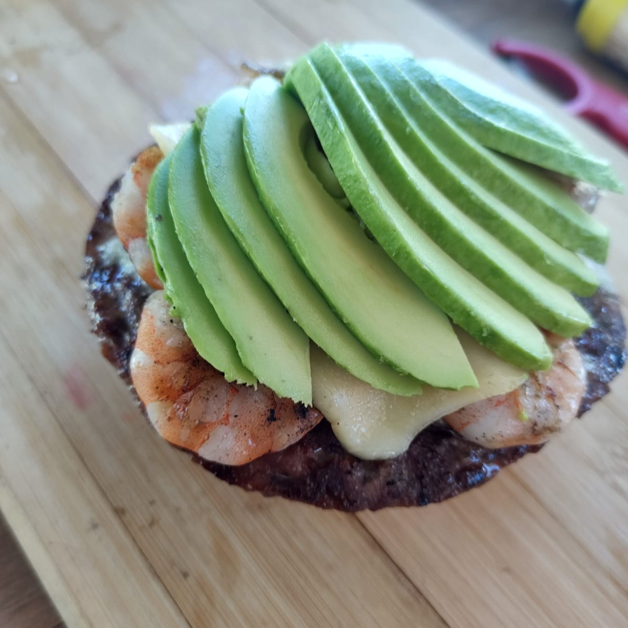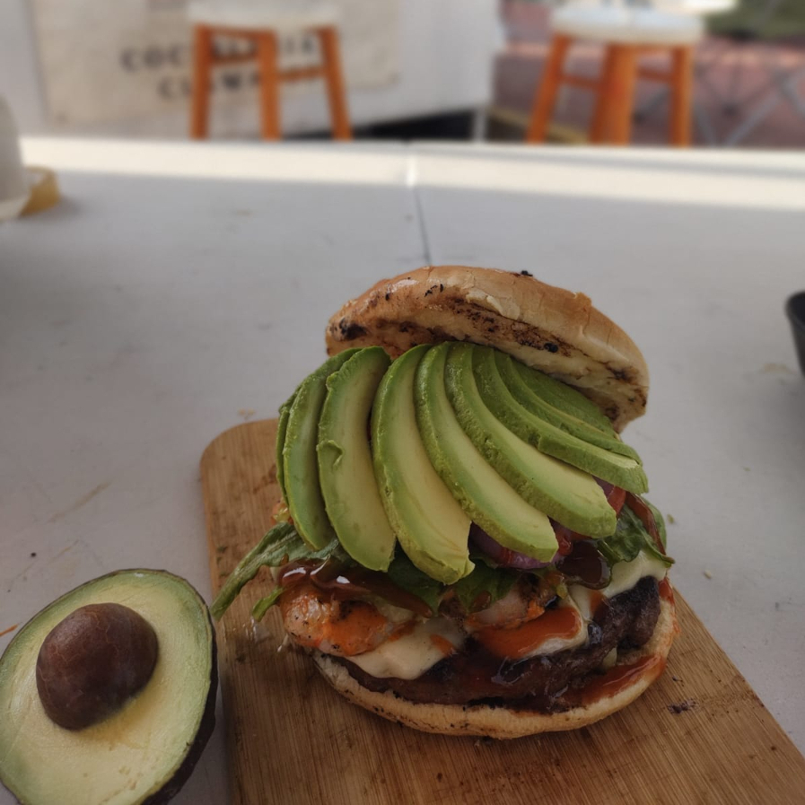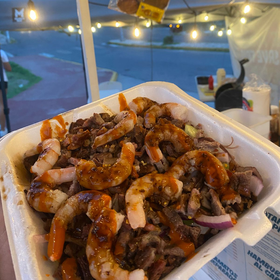 150gr de carne preparda, camaron salteado a las brasas con queso gratinado, con queso, aguacate cortado en modo abanico, pepino, tomate, cebolla morada, mayonesa y catsup