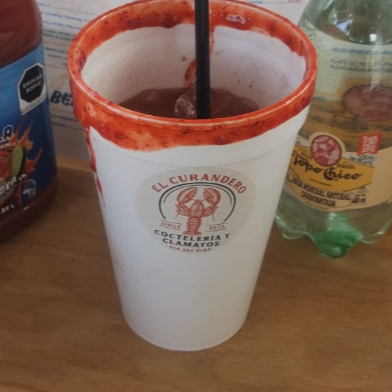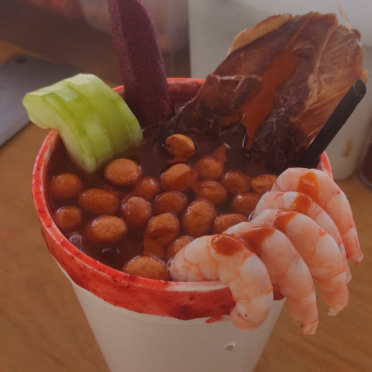 con cacahuate, pepiClamato, hielo, pimienta, sal, cheltepin, salsas negras de la casa, huichol, limon, una banderita de tamarindo y escarchado en chamoy con nuestra receta secreta de agua de camaron, pepino fresco, cacahuate, carne seca y camaron fresco.