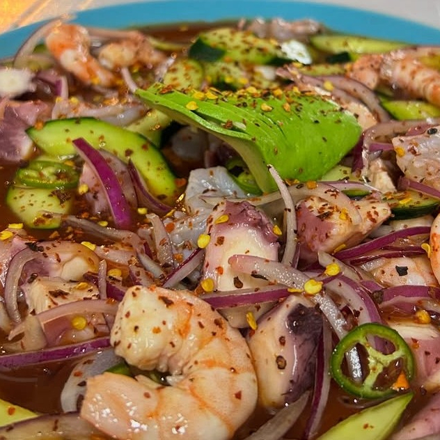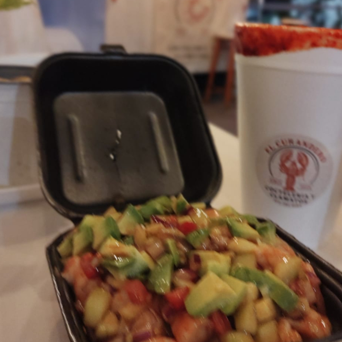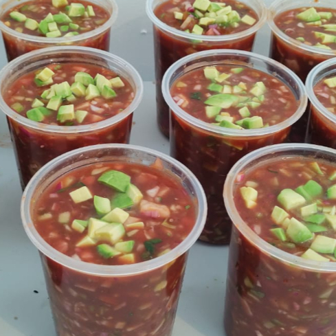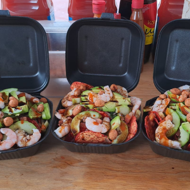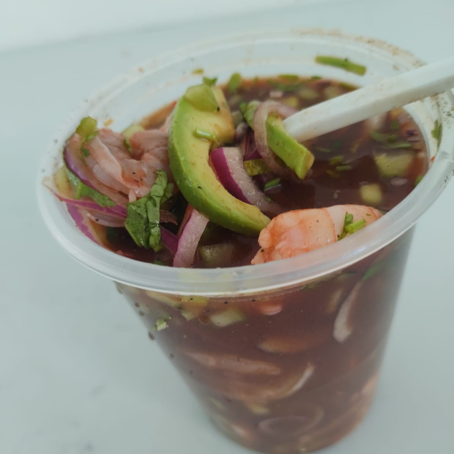 nuestro rico jugo de coctel a base de catsup, pepino, aguacate, cebolla, tomate cortado en cuadros finos con nuestro camaron fresco.