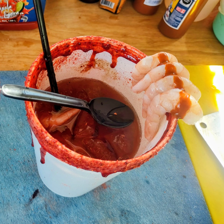 Clamato, hielo, pimienta, sal, cheltepin, salsas negras de la casa, huichol, limon, una banderita de tamarindo y escarchado en chamoy con nuetsro fresco camaron cocido