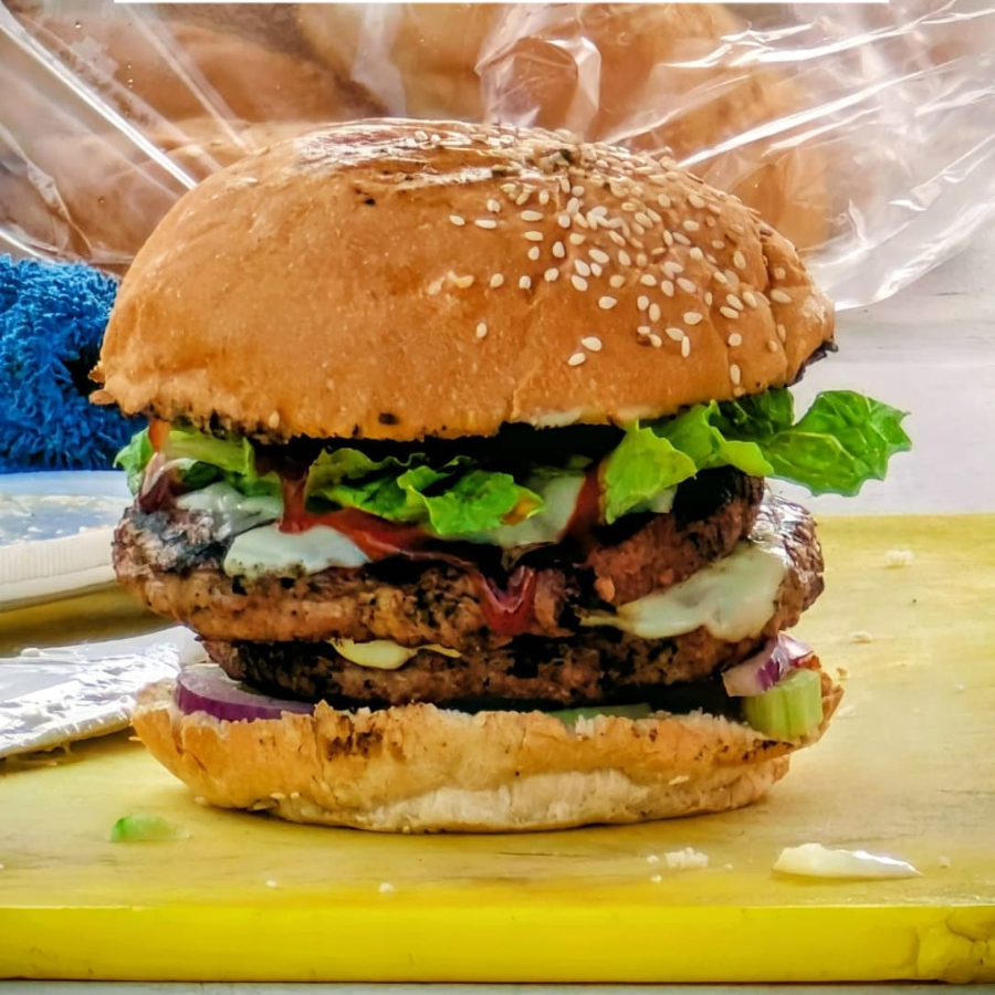 300gr. de carne preparda con doble queso, pepino, tomate, cebolla morada, mayonesa y catsup
