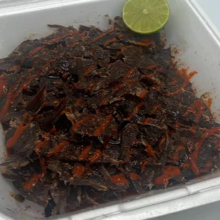 carne seca troceada, zasonada con especies y bañadas con salsas negras de la casa, limon y huichol.