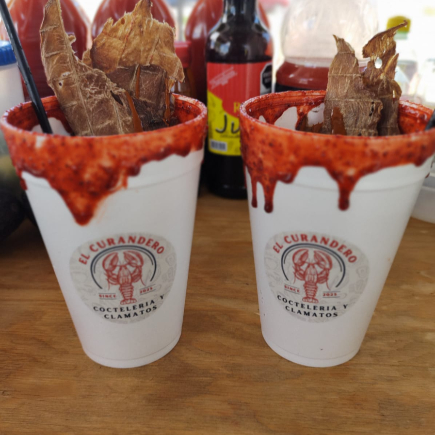 Clamato, hielo, pimienta, sal, cheltepin, salsas negras de la casa, huichol, limon, una banderita de tamarindo y escarchado en chamoy, con nuestra deliciosa carne seca.