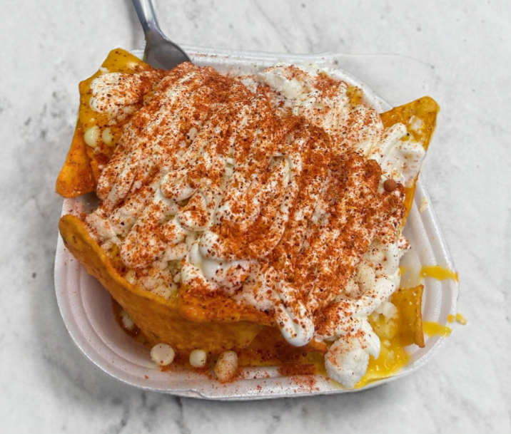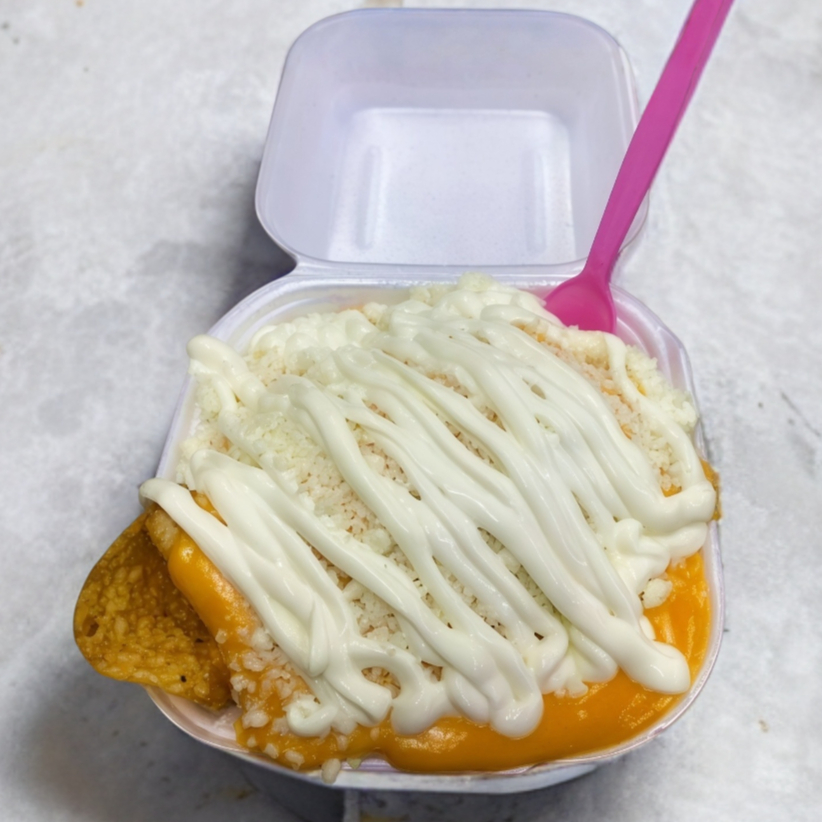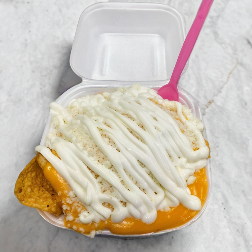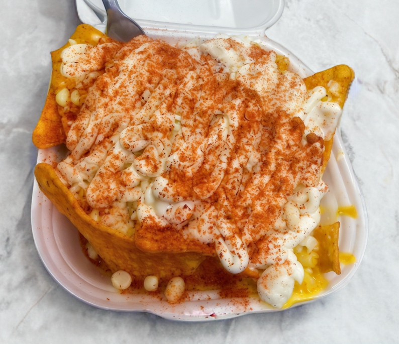 Nachos con elote, queso amarillo, queso blanco, crema y chile al gusto