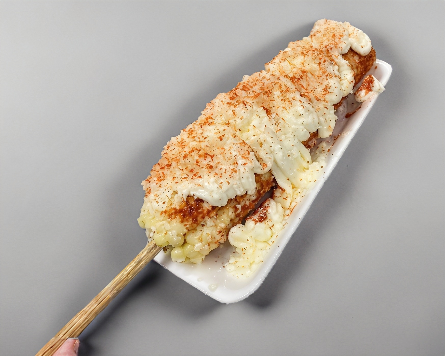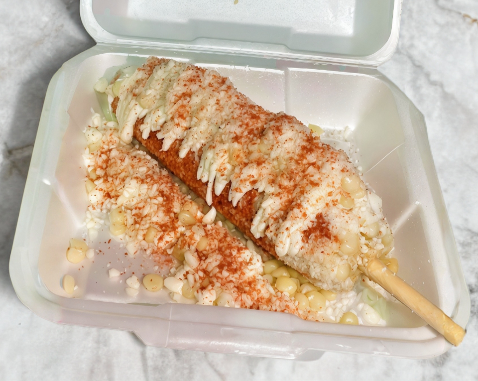 Elote entero con mantequilla, queso blanco, chile, limón, crema y más queso blanco