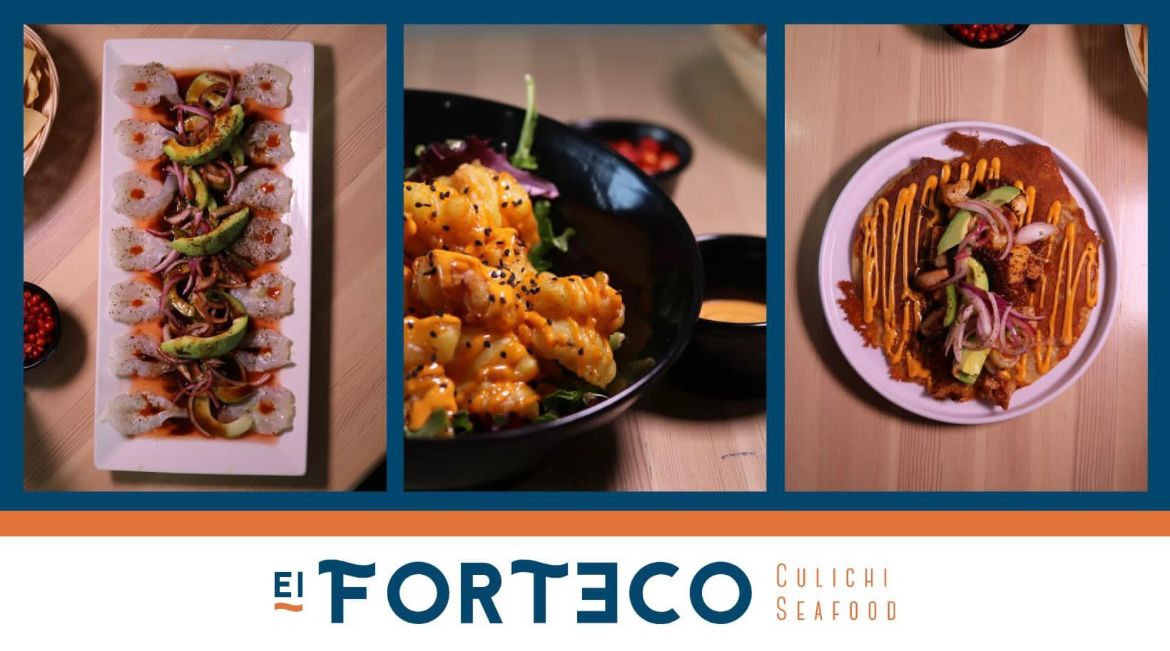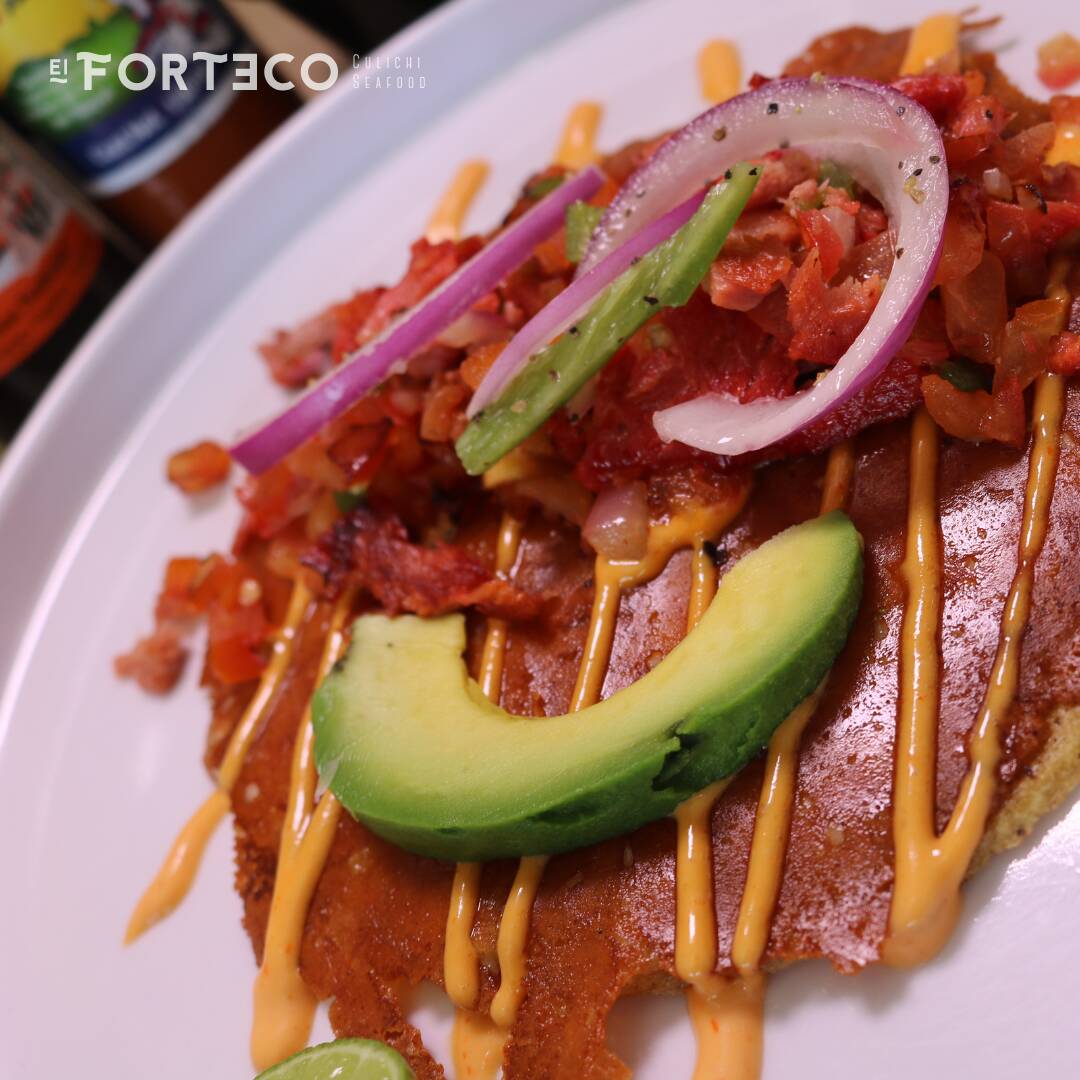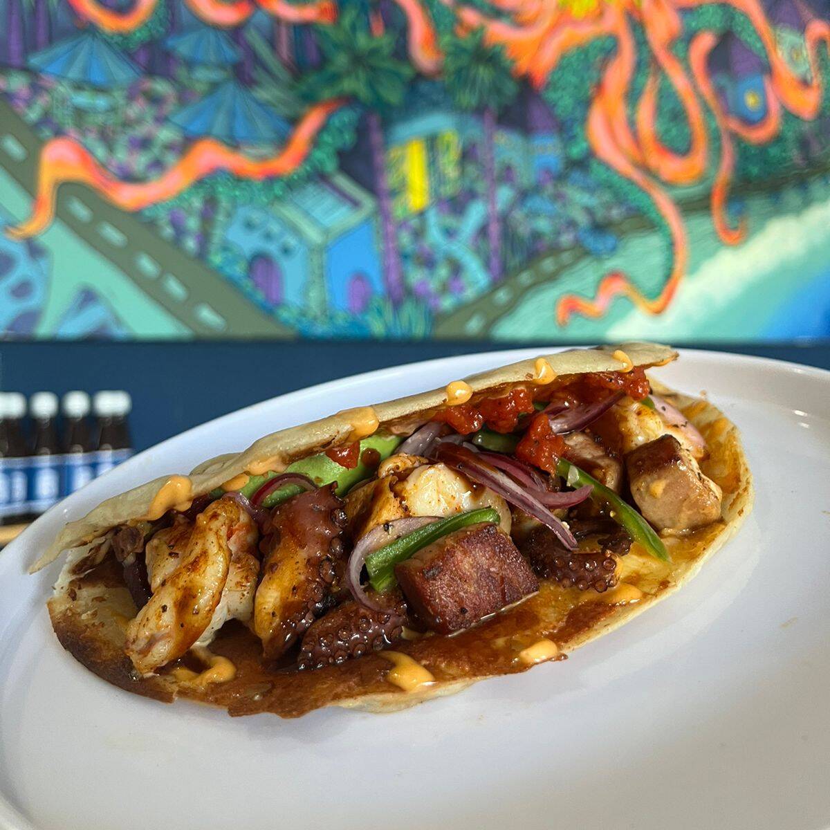 Tortilla de Harina, costra de queso, aderezo forteco, camaron pulpo y atun sarteneados, aguacate y salsa de cebolla con serrano.