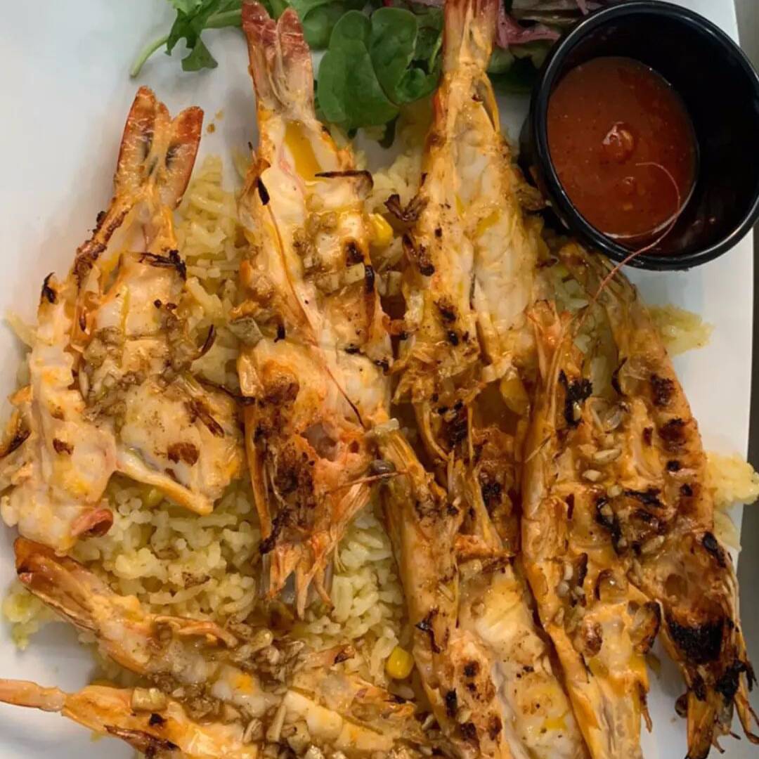 camarones completos zarandeados en un adobo especial, acompañado de ensalada y arroz