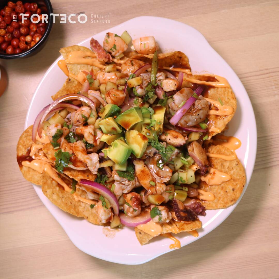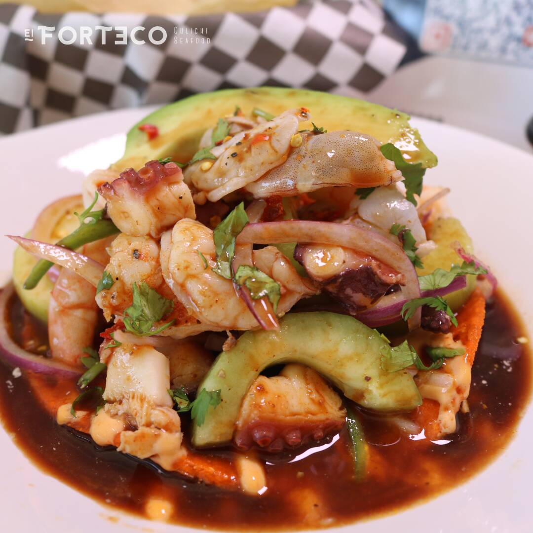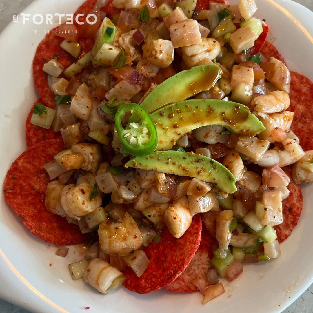 Tostada Roja, aderezo forteco, camaron crudo, cocido y sarteneado, pulpo, pepino, cebolla, serrano y aguacate, salsa citrica especial de la casa.