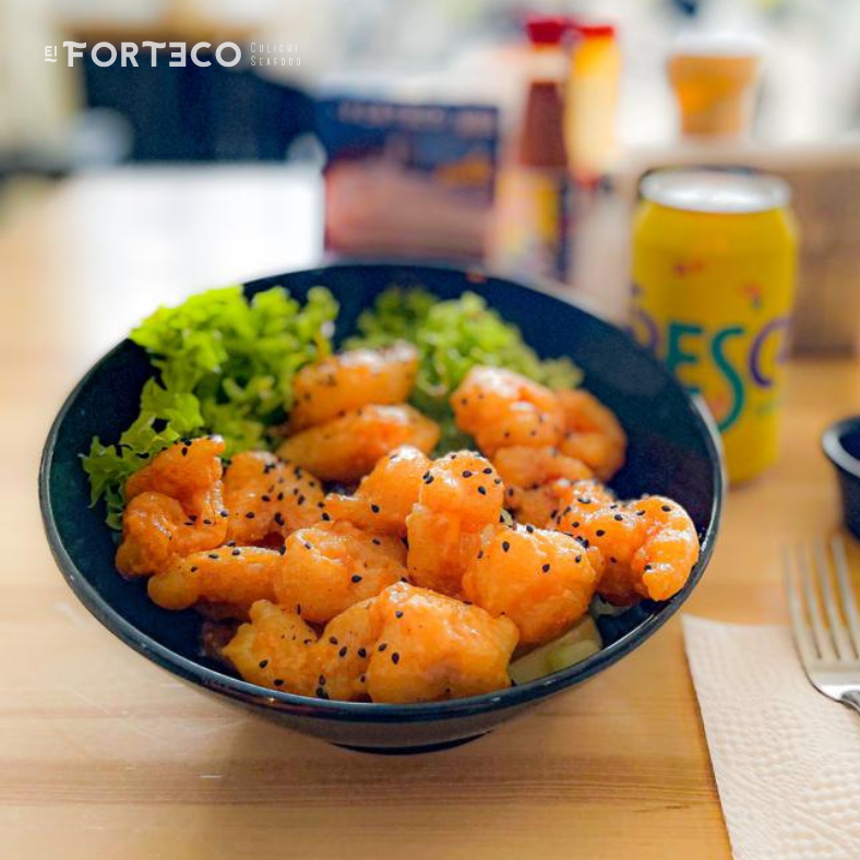 Camarones tempura, bañados en aderezo especial de la casa, pica de ajonjoli, posados sobre una cama de lechuga