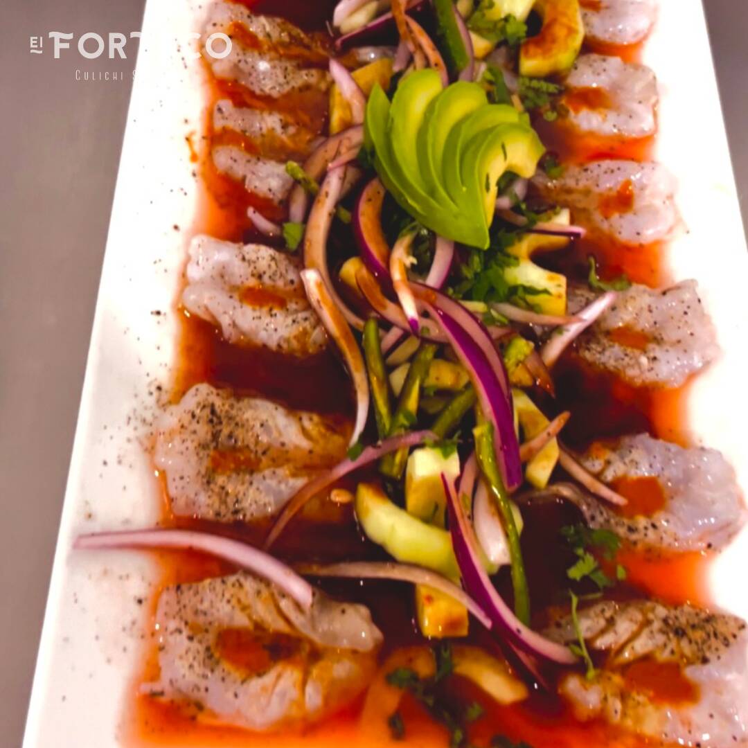 Camaron crudo y cocido bañados en una deliciosa salsa de chile de arbol, receta de la casa, pepino, cebolla morada, cilantro, chile serrano y aguacate.
