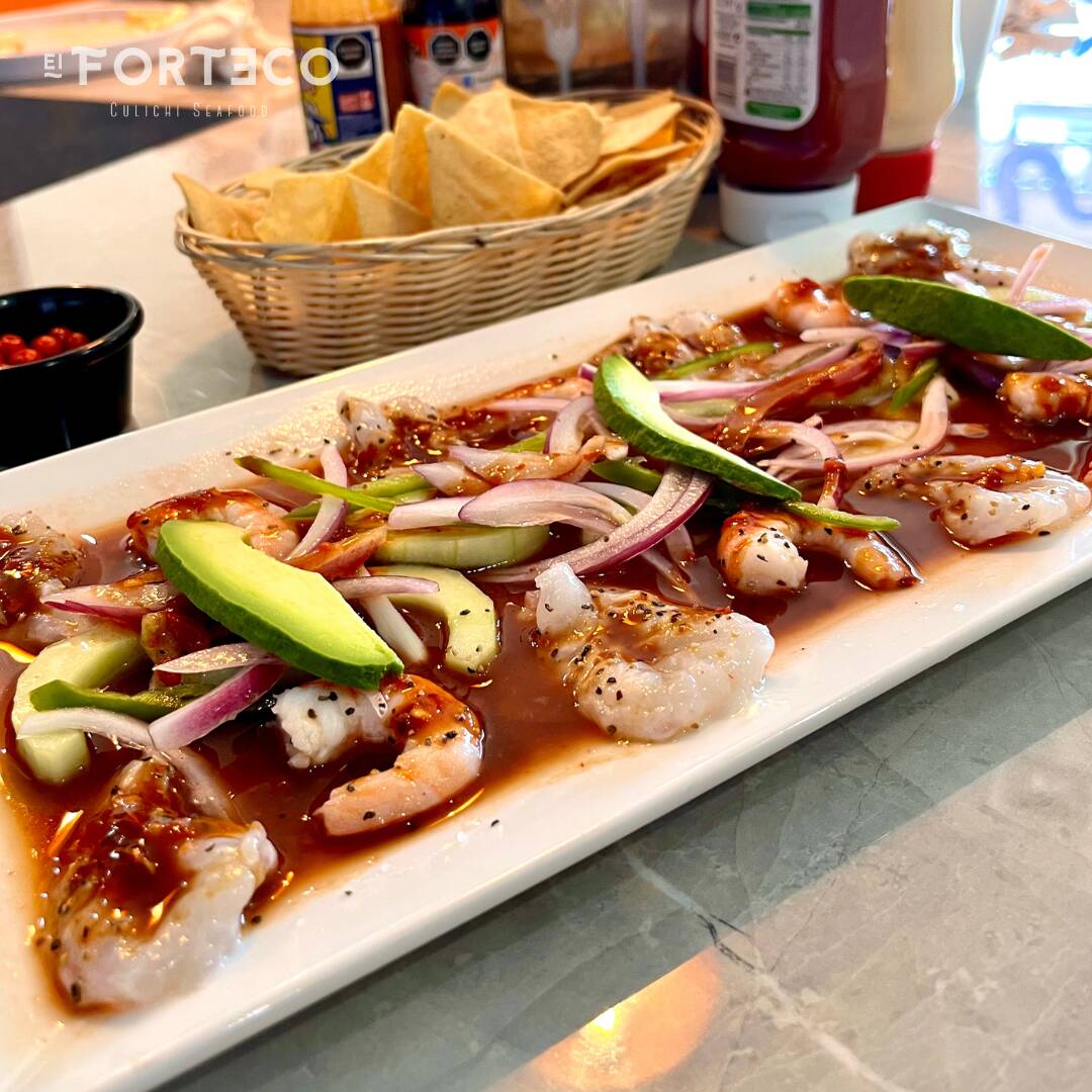 Camaron crudo y cocido bañados en una deliciosa salsa negra, receta de la casa, pepino, cebolla morada, cilantro, chile serrano y aguacate.