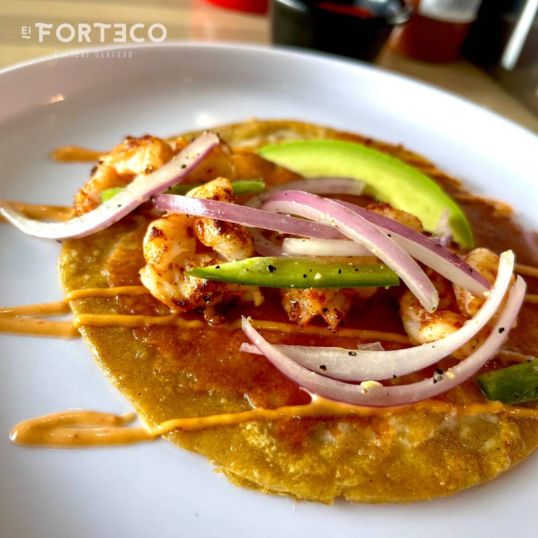 Tortilla Amarilla con costra de queso aderezo forteco, camarones sarteneados, aguacate, y salsa de cebolla morada con serrano