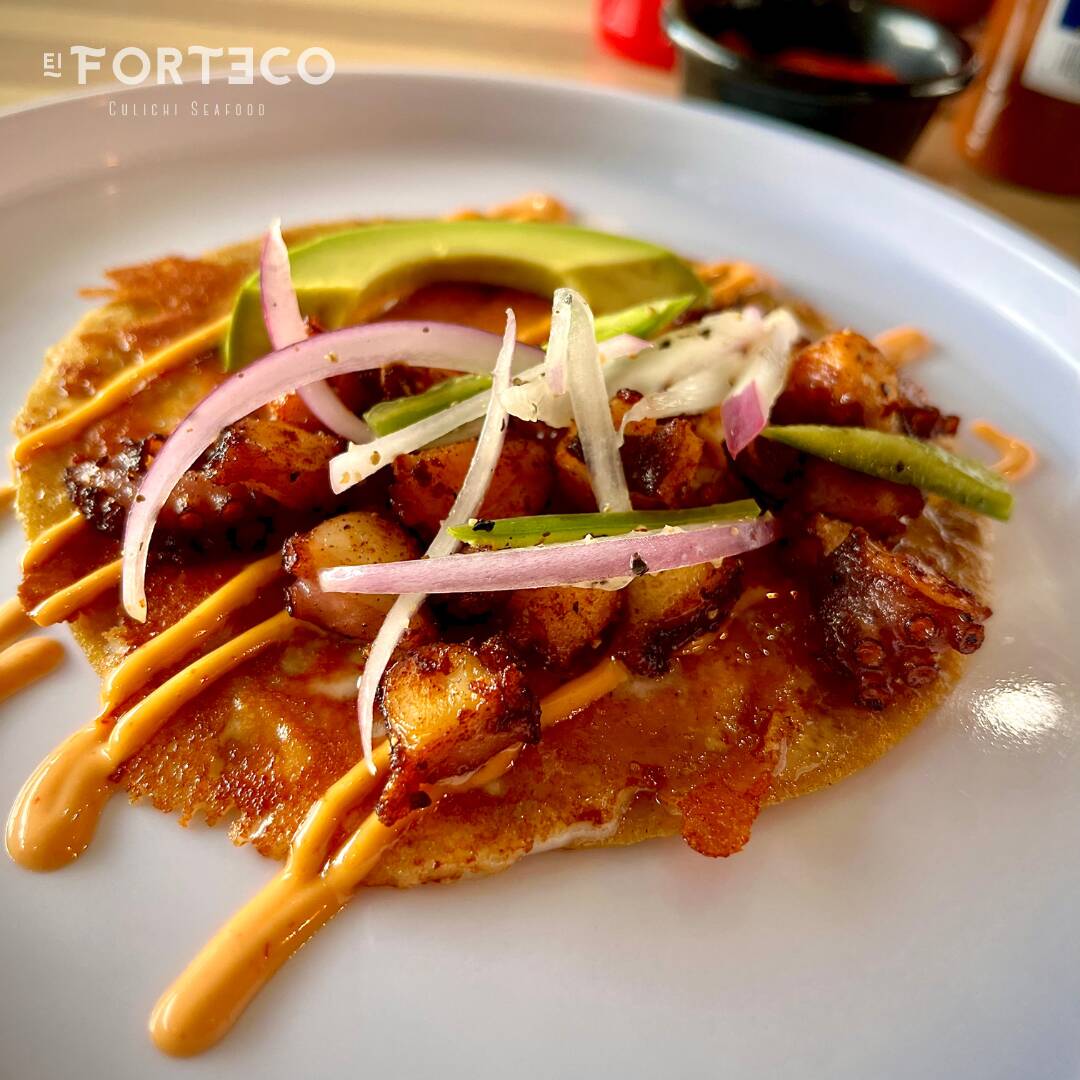Tortilla Amarilla con costra de queso aderezo forteco, tentaculos de pulpo sarteneados, aguacate, y salsa de cebolla morada con serrano