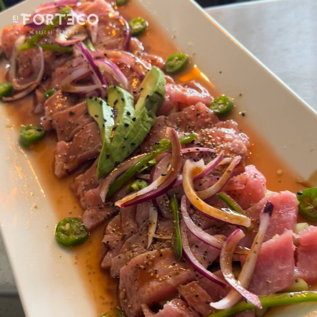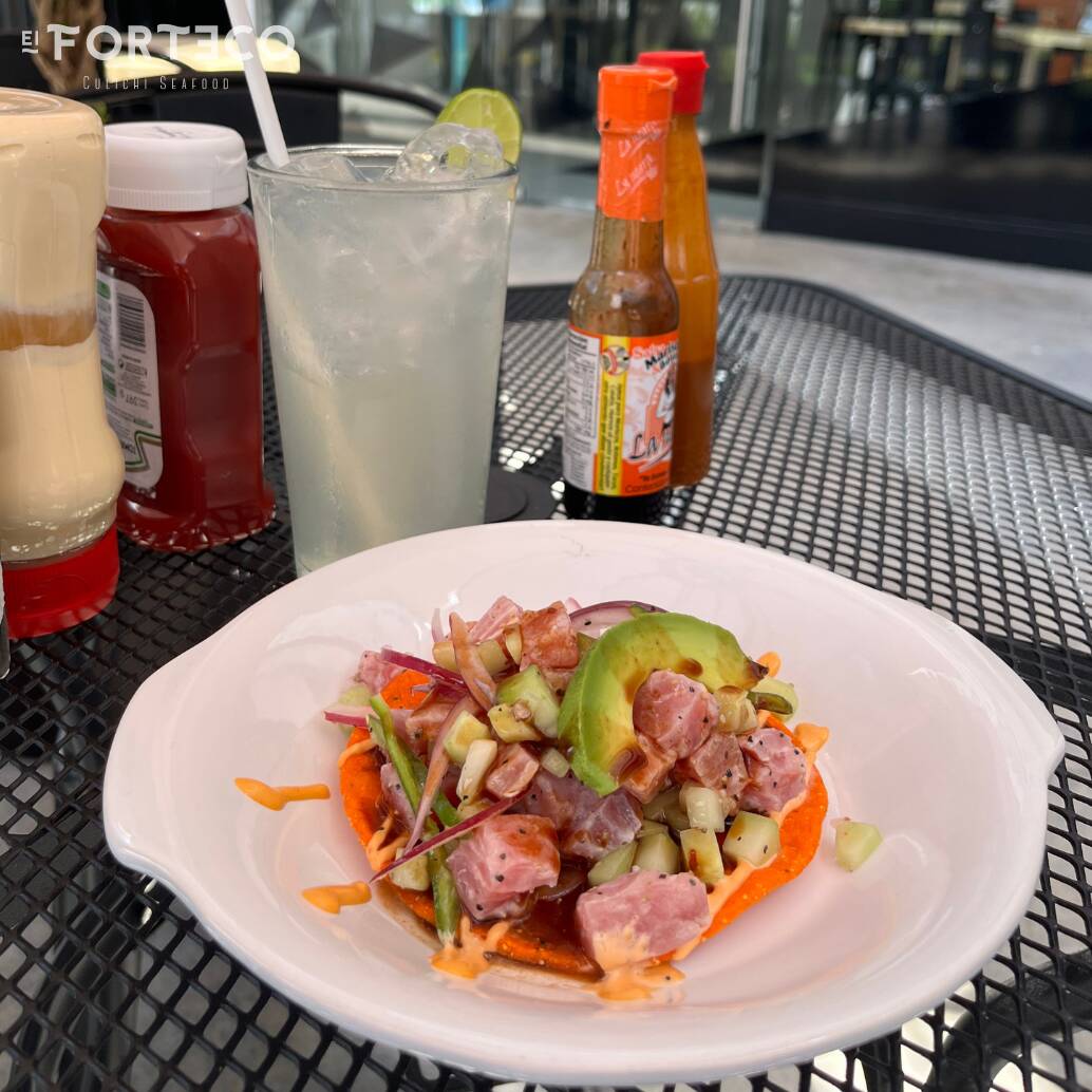 Tostada Roja, aderezo forteco, cubos de atun fresco, curtidos con un salsa negra citrica especial de la casa, pepino, cebolla morada, serrano, aguacate.