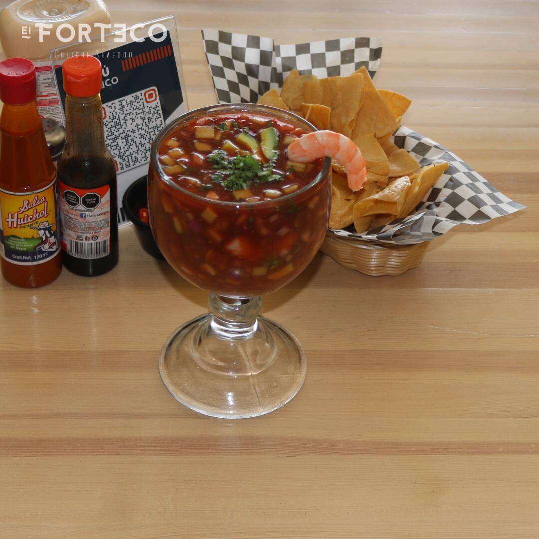 Camaron, cebolla morada, tomate, pepino, cilantro, chile serrano, clamato y salsa