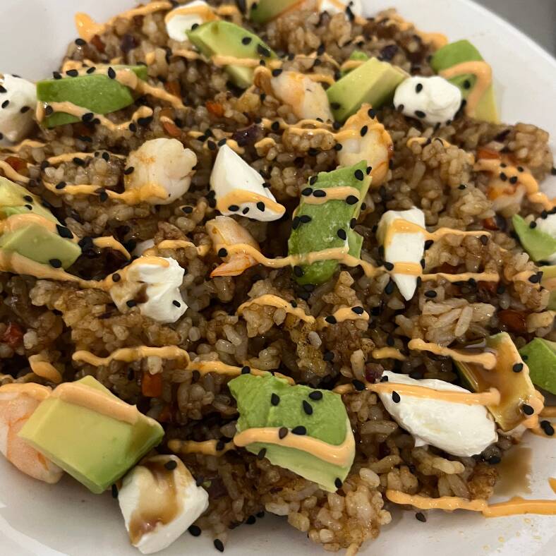Arroz de sushi frito con vegetales, camaron, aguacate, philadelphia, ajonjoli y aderezo forteco