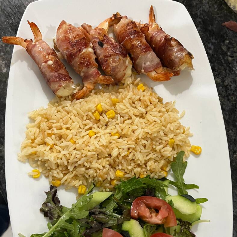 Deliciosos camarones rellenos de queso envueltos de tocino, acompañados de arroz y ensalada.