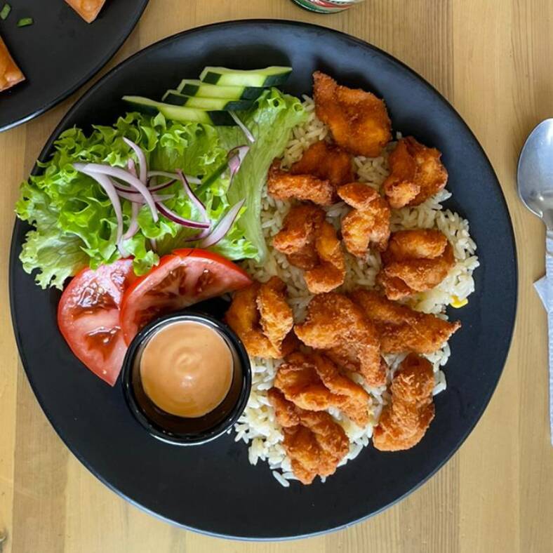 Camarones Empanizados acompañados de arroz y ensalada.