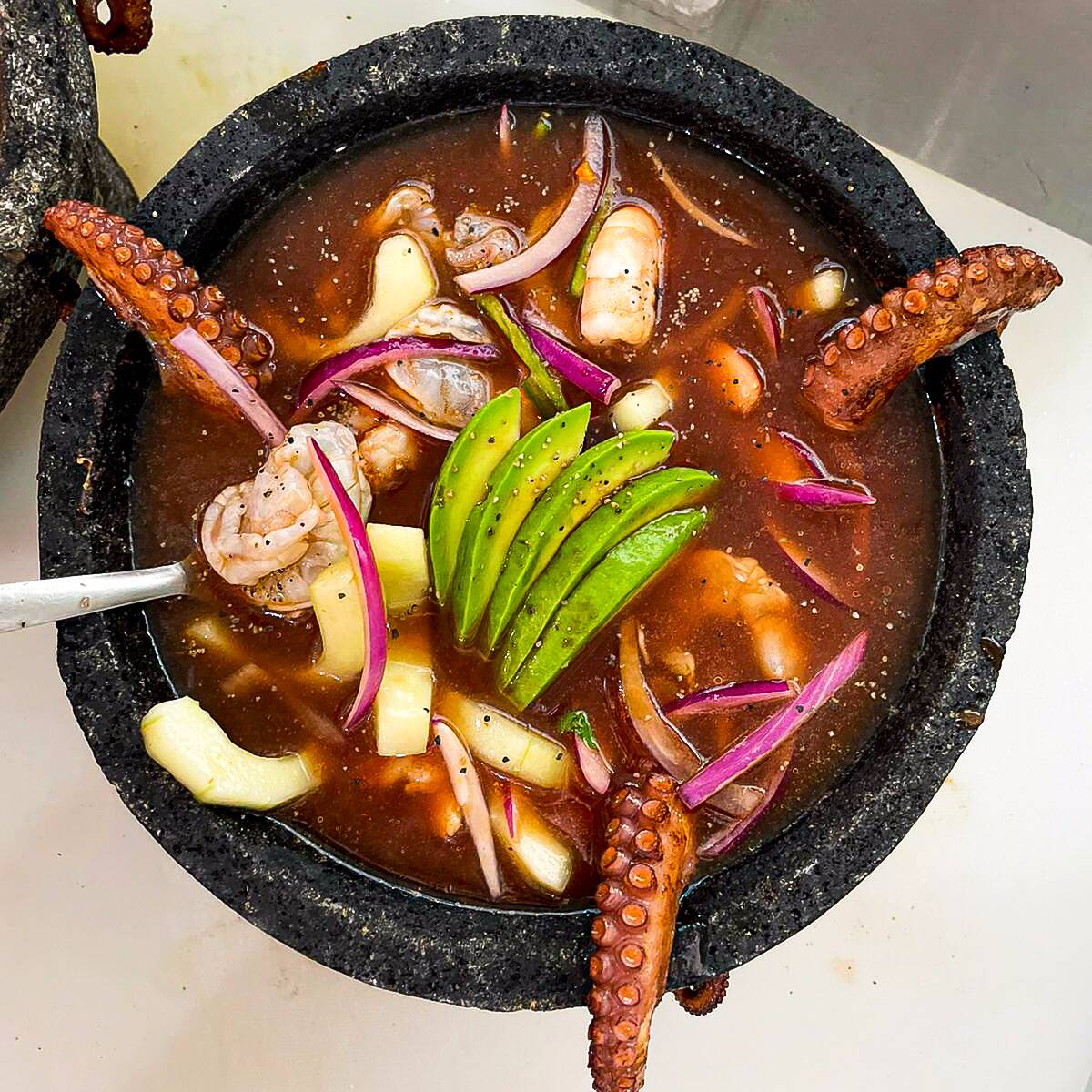 Tentaculos de pulpo, camaron cocido, camaron crudo, pepino, cebolla morada, cilantro, chile serrano, aguacate, salsa negra y clamato