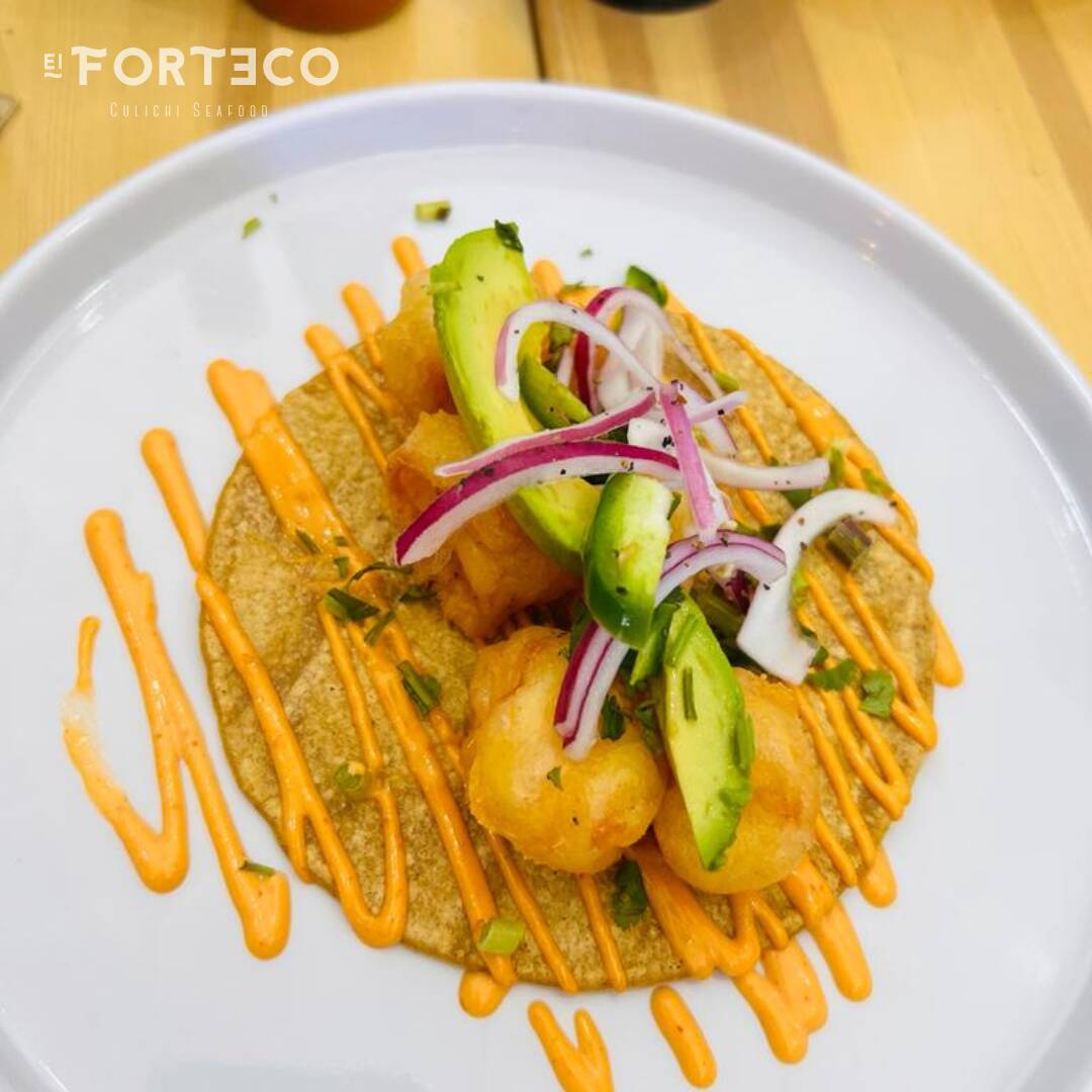 Tortilla Amarilla con aderezo forteco y camarones capeados, cebolla morada y chile serrrano