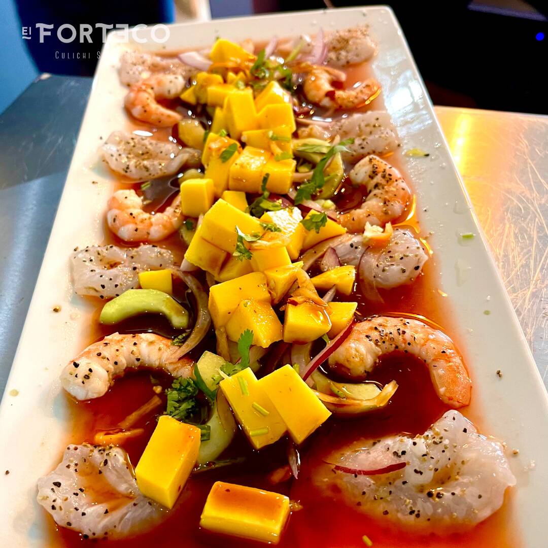 Camaron crudo y cocido bañados en una deliciosa salsa de habanero, receta de la casa, cubitos de mango, pepino, cebolla morada, cilantro, chile serrano y aguacate.