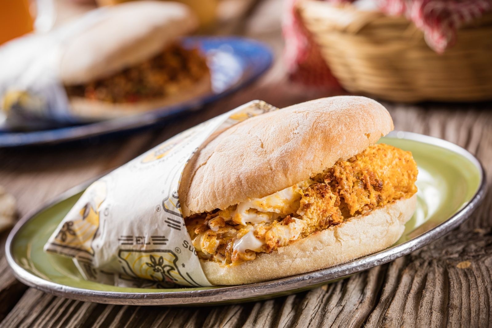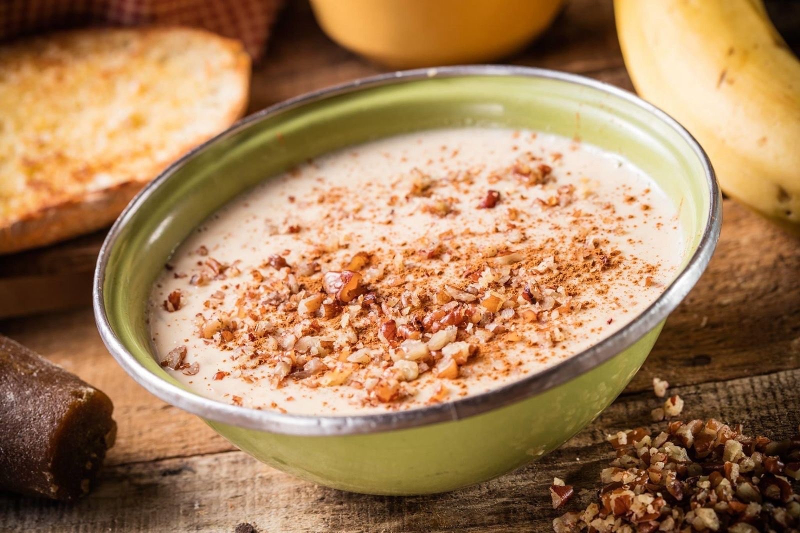 Acompañada con platano, pan tostado y los ingredientes de la casa