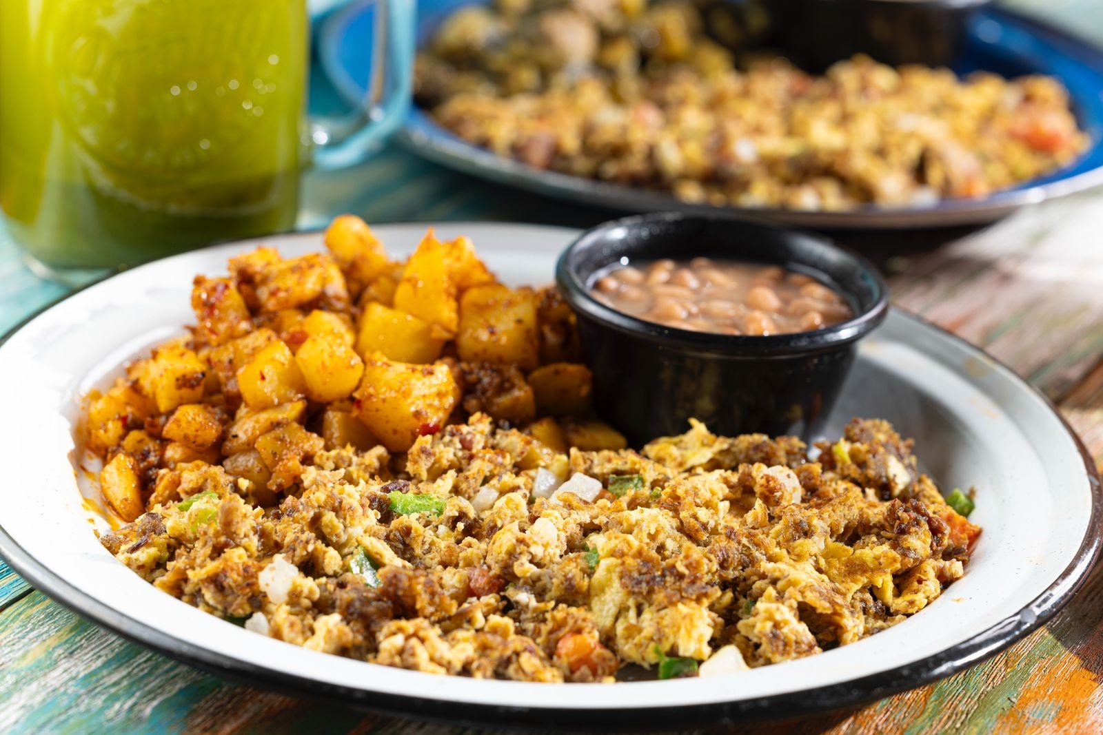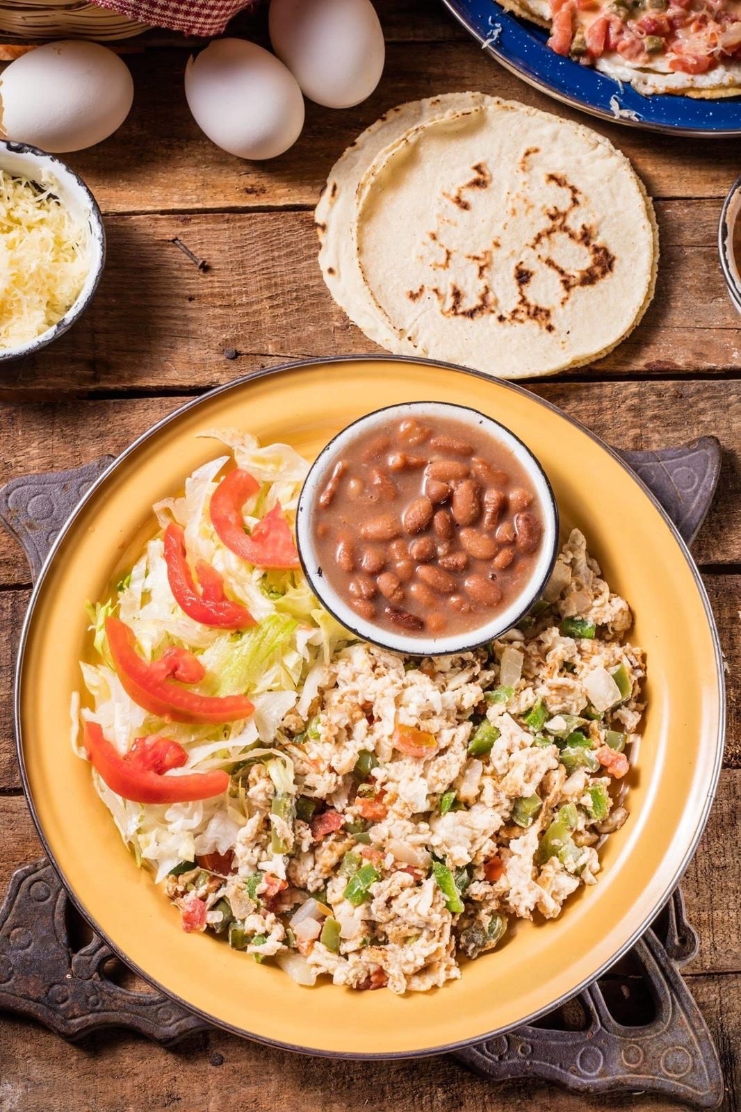 HUEVOS REVUELTOS CON MACHACA A LA MEXICANA ACOMPAÑADOS DE CHILAQUILES O GUISADO