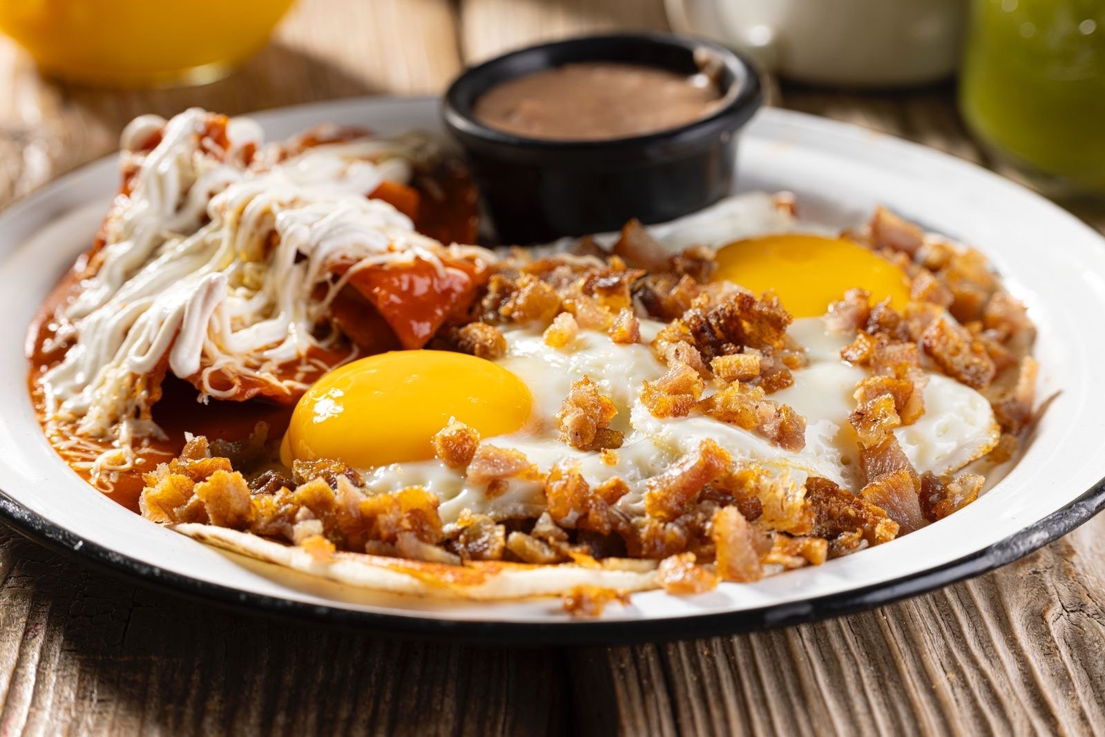 CON FRIJOL, CHORIZO, HUEVO, BAÑADOS EN SALSA RANCHERA