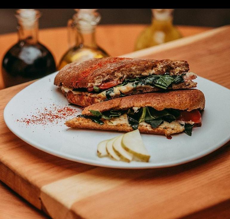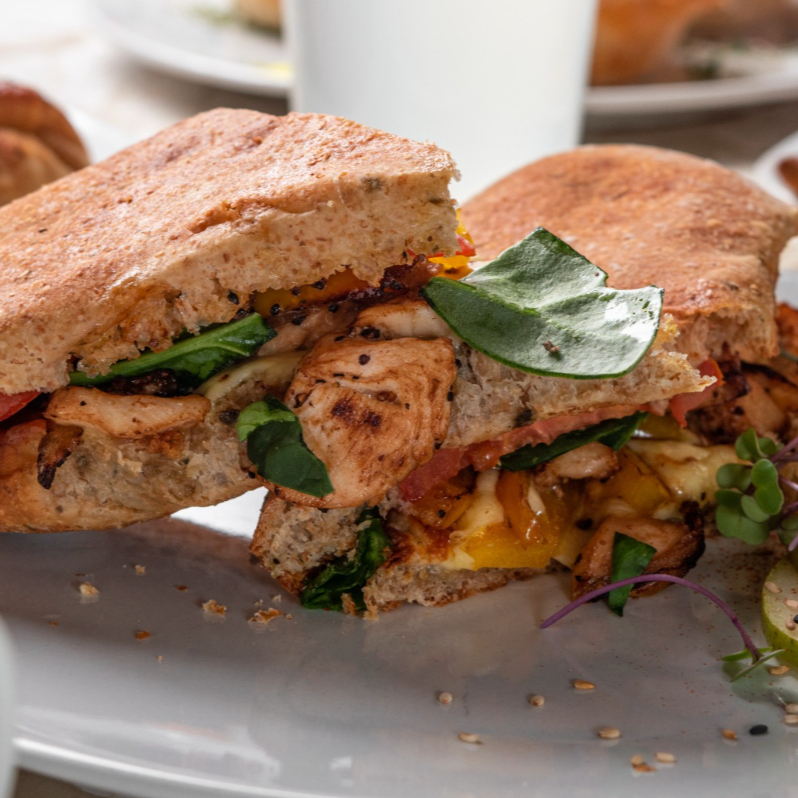 Preparado con pan integral de la casa, pollo a la plancha sazonado con cebolla y pimiento morron, espinaca, queso y rebanadas de tomate, todo calentado al horno.