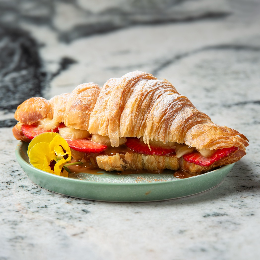 Delicioso croissant relleno de nutella, fresa y plátano