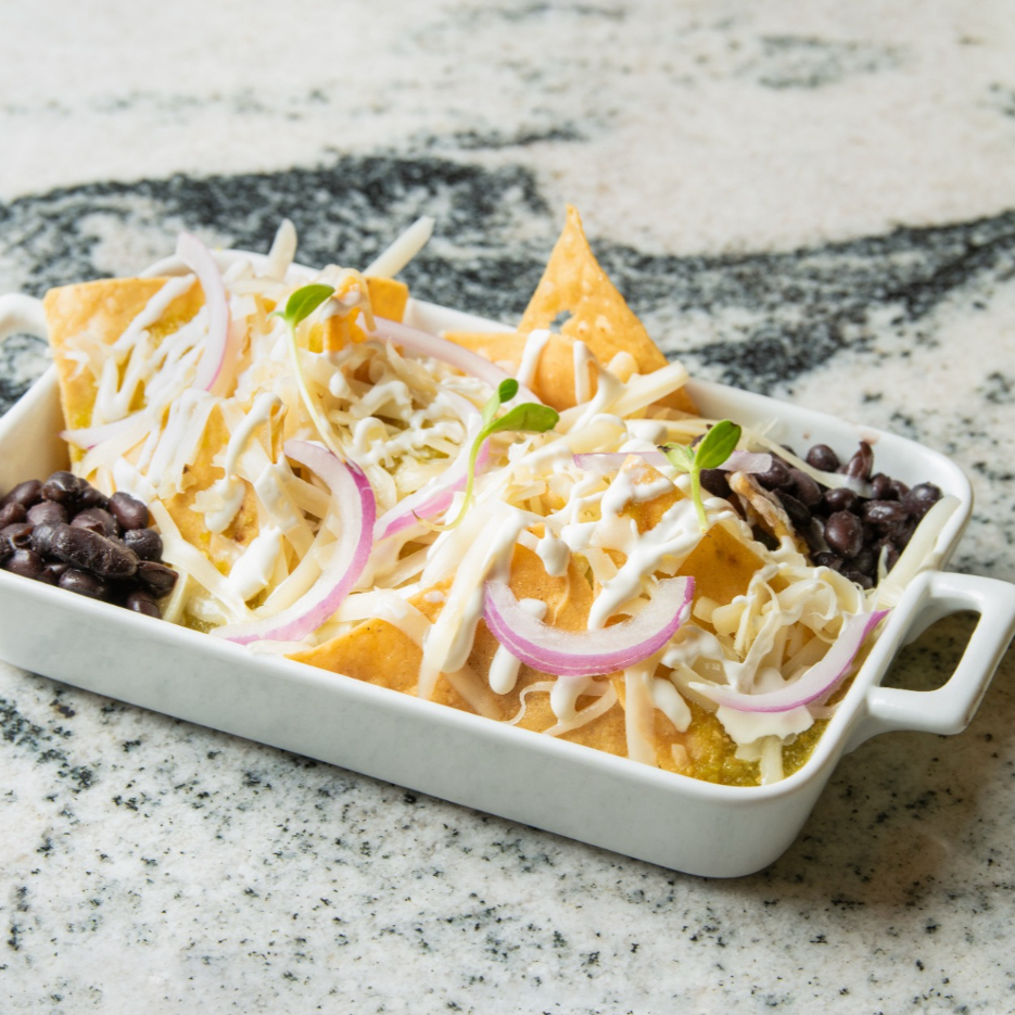 Totopos bañados en la salsa verde con queso menonita, cebolla morada, crema y frijoles negros graneados.