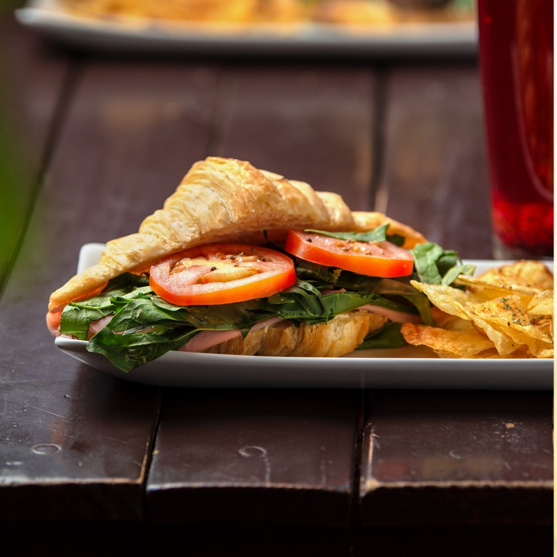 Croissant preparado en nuestra panadería relleno de cabra cream, jamon de pierna, tomate y hojas verdes. Acompañado de papas caseras.