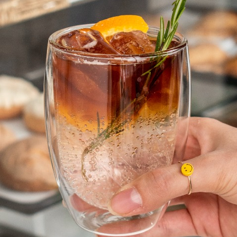 Cafe extraido en frio servido en las rocas con agua tonica y un toque de romero y naranja