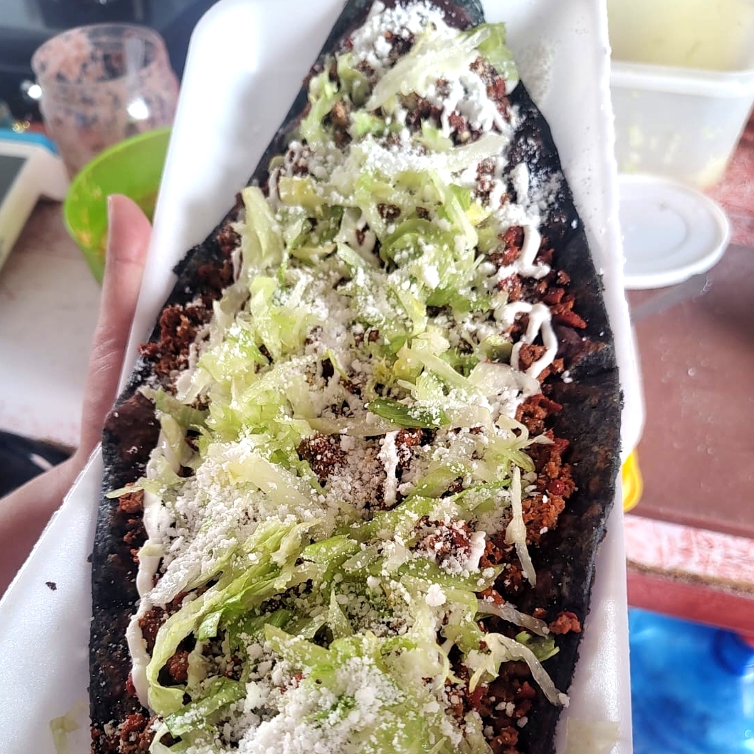 Delicioso tlacoyo con suadero, acompañado de crema, queso y lechuga.