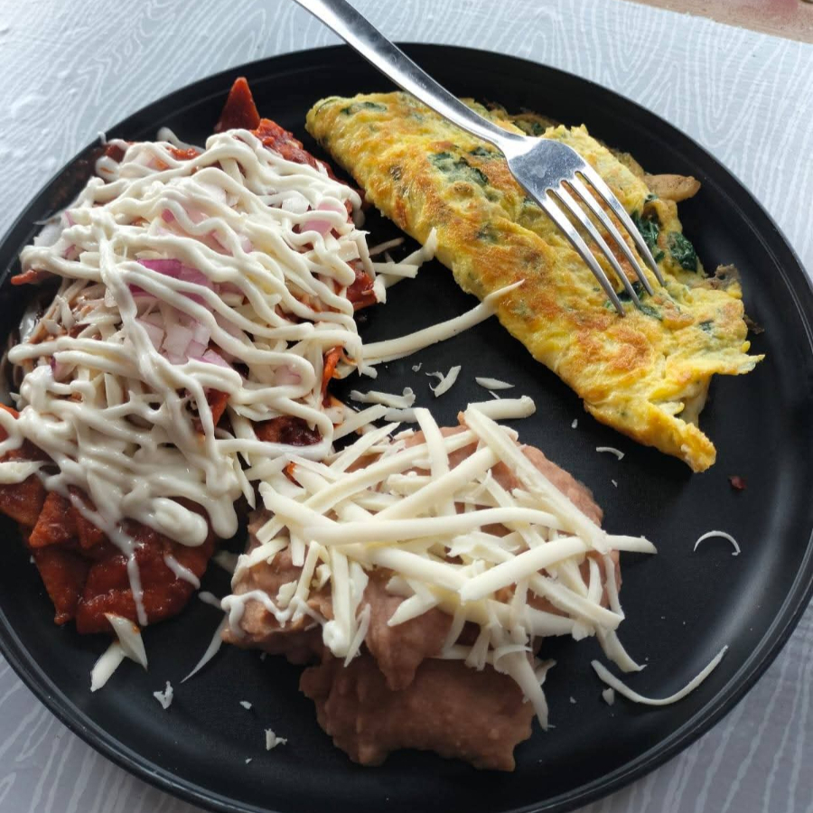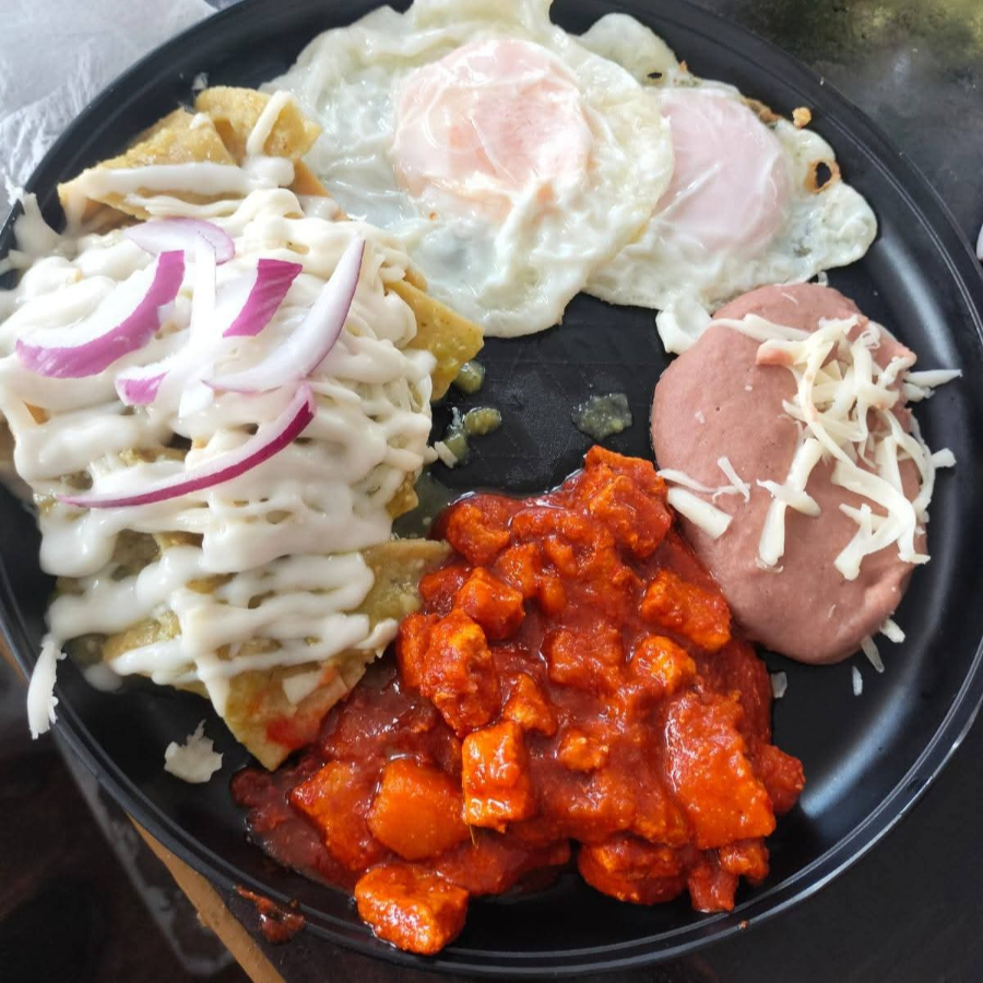 Chilaquiles de tu elección, huevito al gusto, frijolitos, crema y queso.
