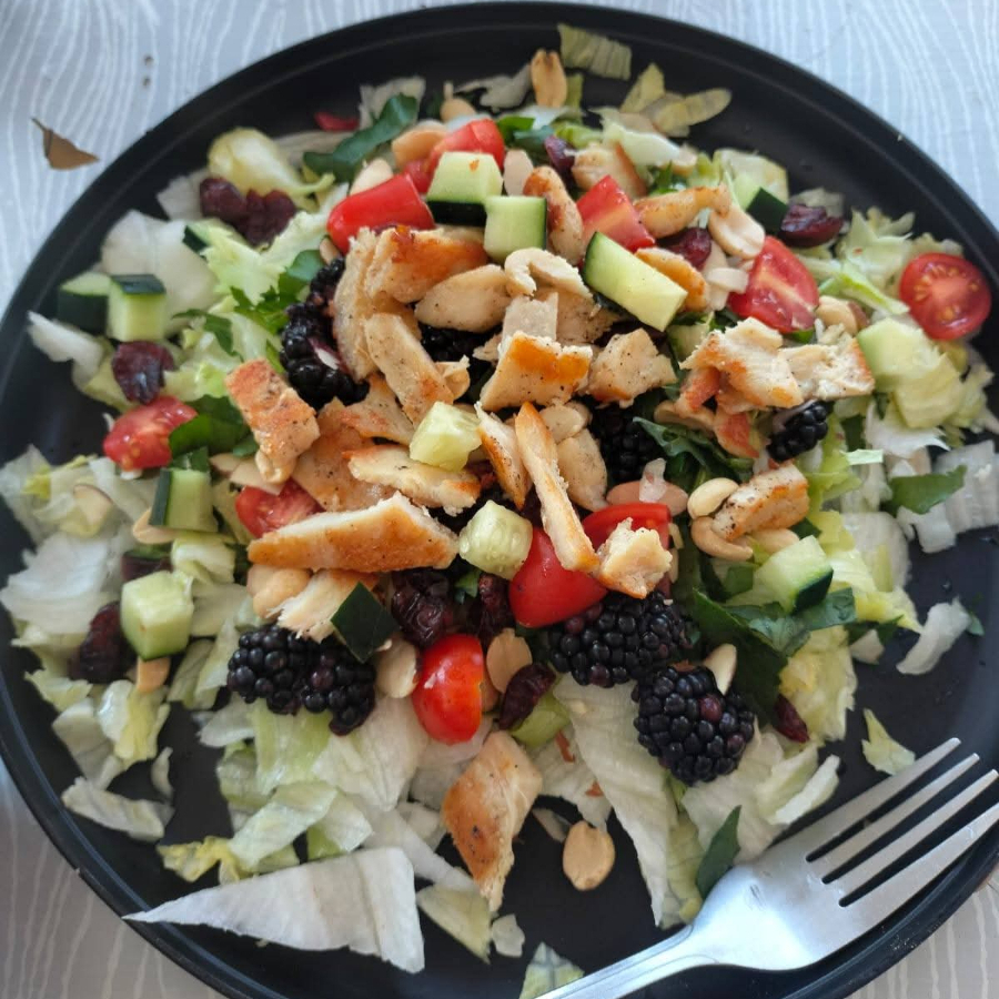 Con pollo a la plancha, lechuga, espinaca, pepino, tomate cherry, zaramoras.