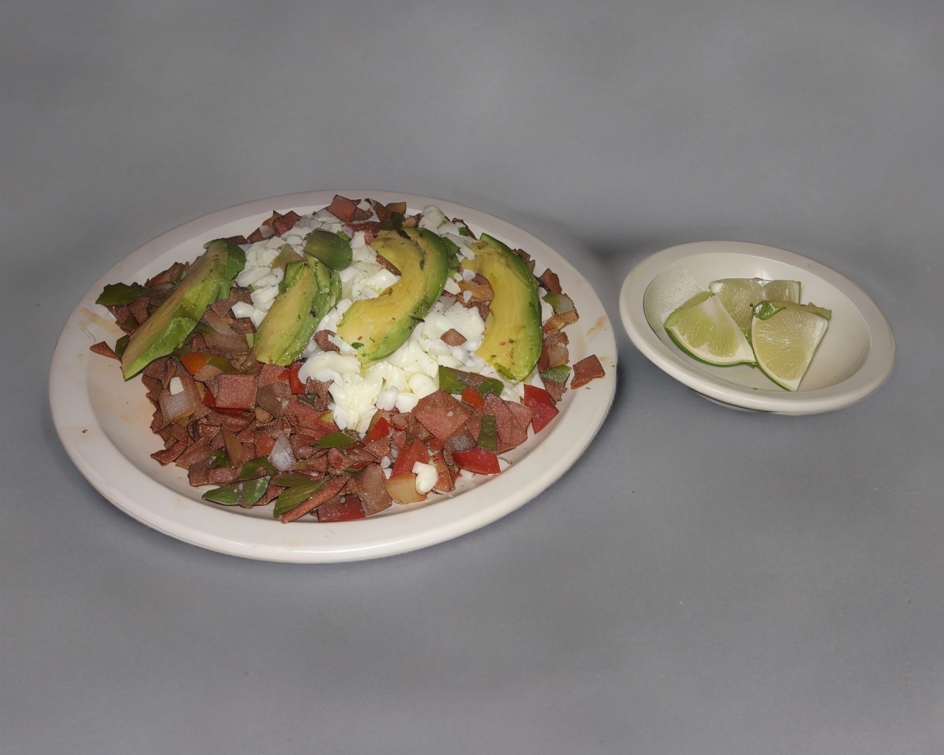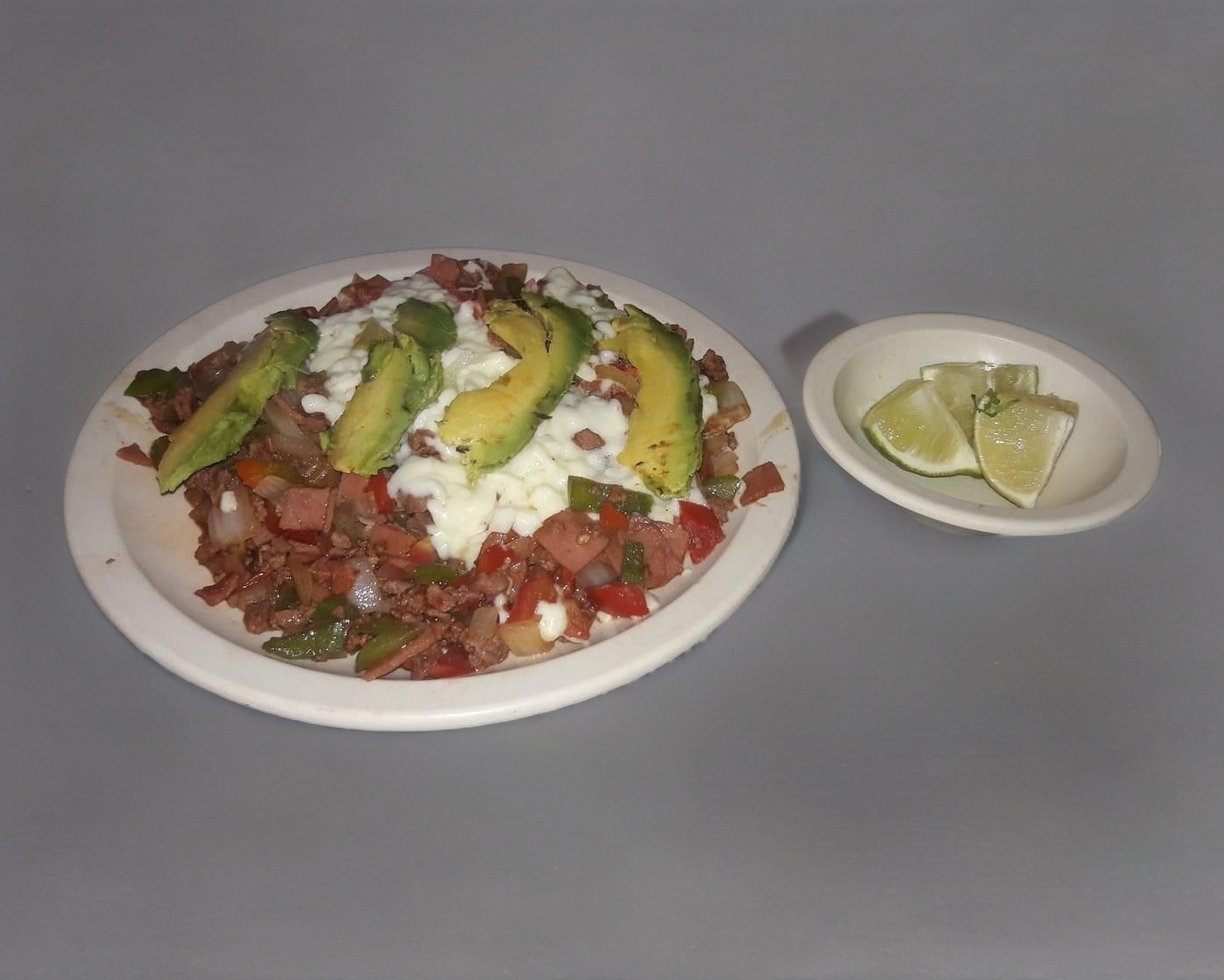 Bistec, tocino, jamón, tomate, cebolla, morrón, aguacate, queso y tortillas.
