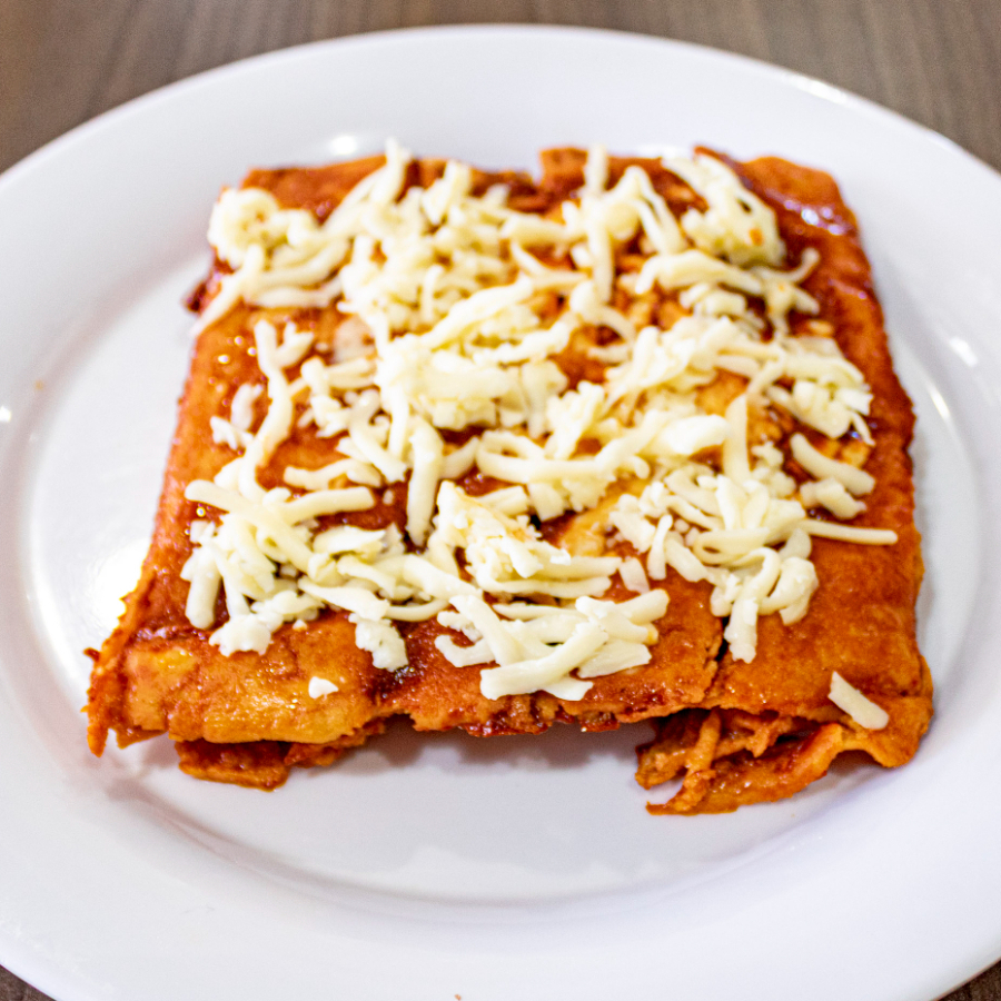 Tortillas de maíz bañadas en salsa roja, con queso rallado