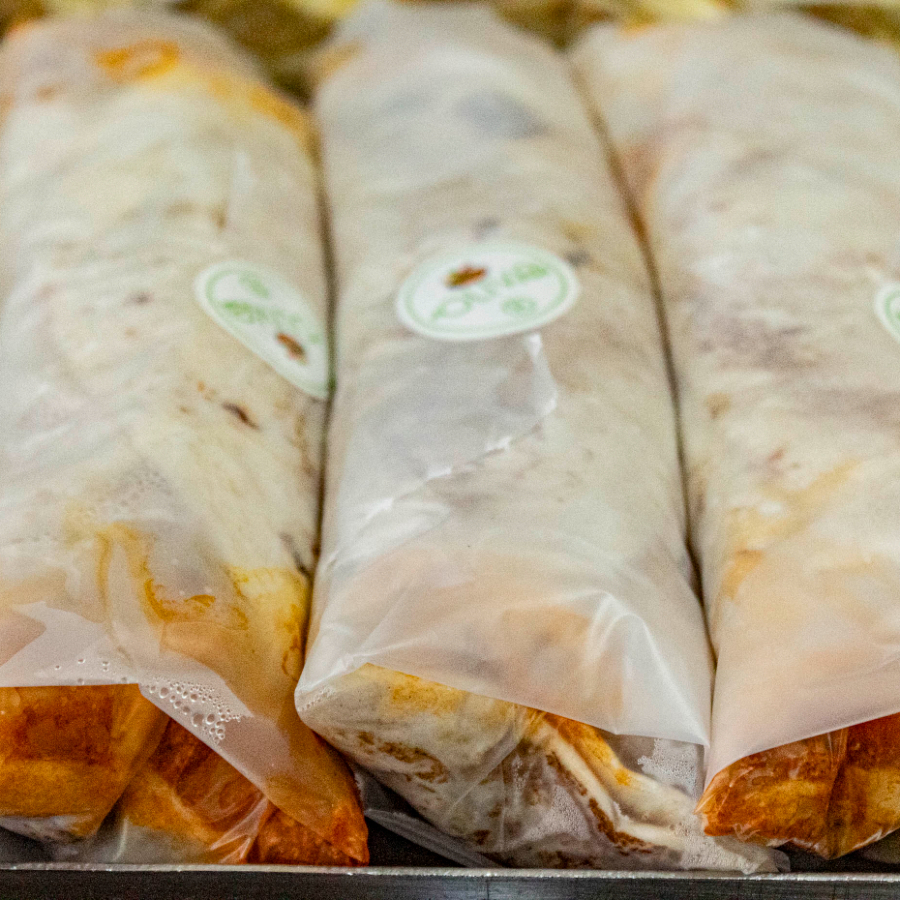 Clásica combinación de frijoles refritos con chorizo sazonado, envueltos en tortilla de harina calientita.